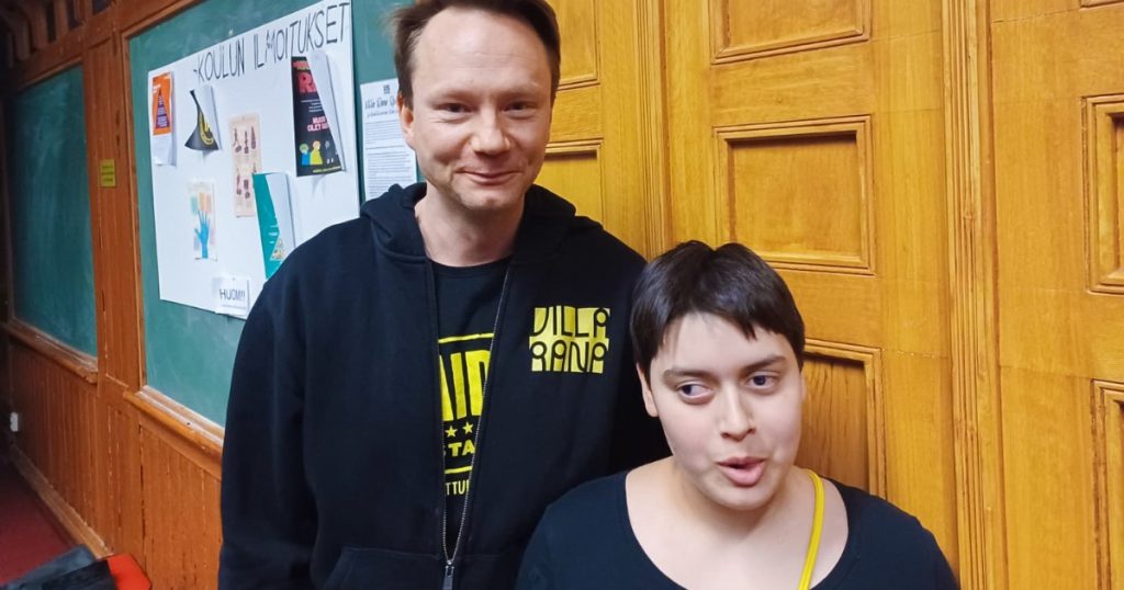 ”Föreställningen var händelserik och rolig. Jag fick vara med och delta”, berättar åttondeklassisten Miglena nöjt efter deltagit i den syntolkade Teatterikones forumteaterföreställning Yhteys poikki. Miglena kunde ta del av upplevelsen tack vare syntolkningen.